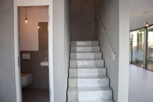 Das Erdgeschoss überzeugt durch ein außergewöhnliches, offen gestaltetes Raumkonzept. Küche, Ess- und Wohnbereich gehen fließend ineinander über und werden durch einen zentral positionierten Treppenkern aus Sichtbeton strukturiert. Dieses architektonische Element bildet das Herzstück des Hauses und gliedert den Raum, ohne ihn zu trennen. Um den Treppenkern herum entfaltet sich ein großzügiger, umlaufender Wohnbereich, in dem die einzelnen Funktionen harmonisch miteinander verbunden sind. Zudem befindet sich im Erdgeschoss ein Gäste-WC.