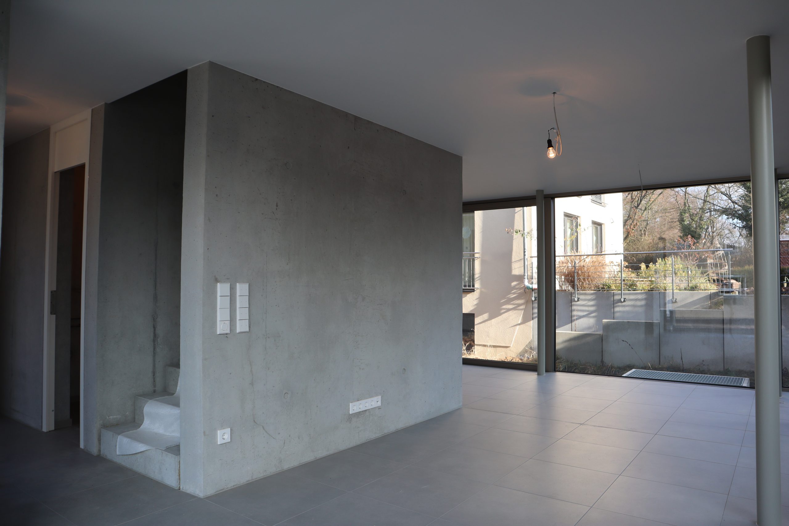 Eine umlaufende, großflächige Verglasung mit durchgehender Fensterfront lässt viel Tageslicht in den Raum und schafft ein helles, offenes Wohngefühl mit einer besonderen Verbindung zum Außenbereich. Die Kombination aus Sichtbeton, klaren Linien und Glas unterstreicht den modernen und exklusiven Charakter des Hauses.