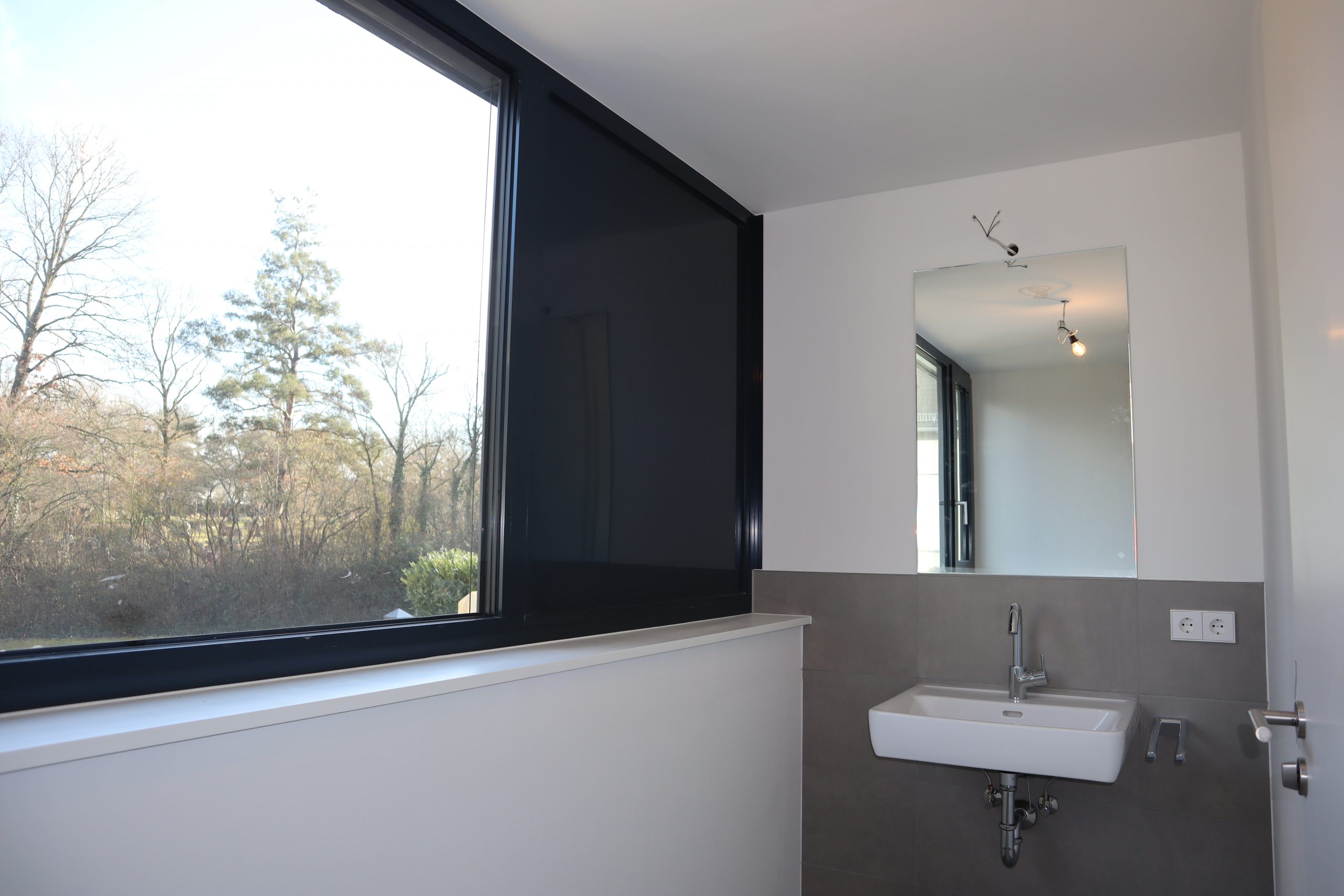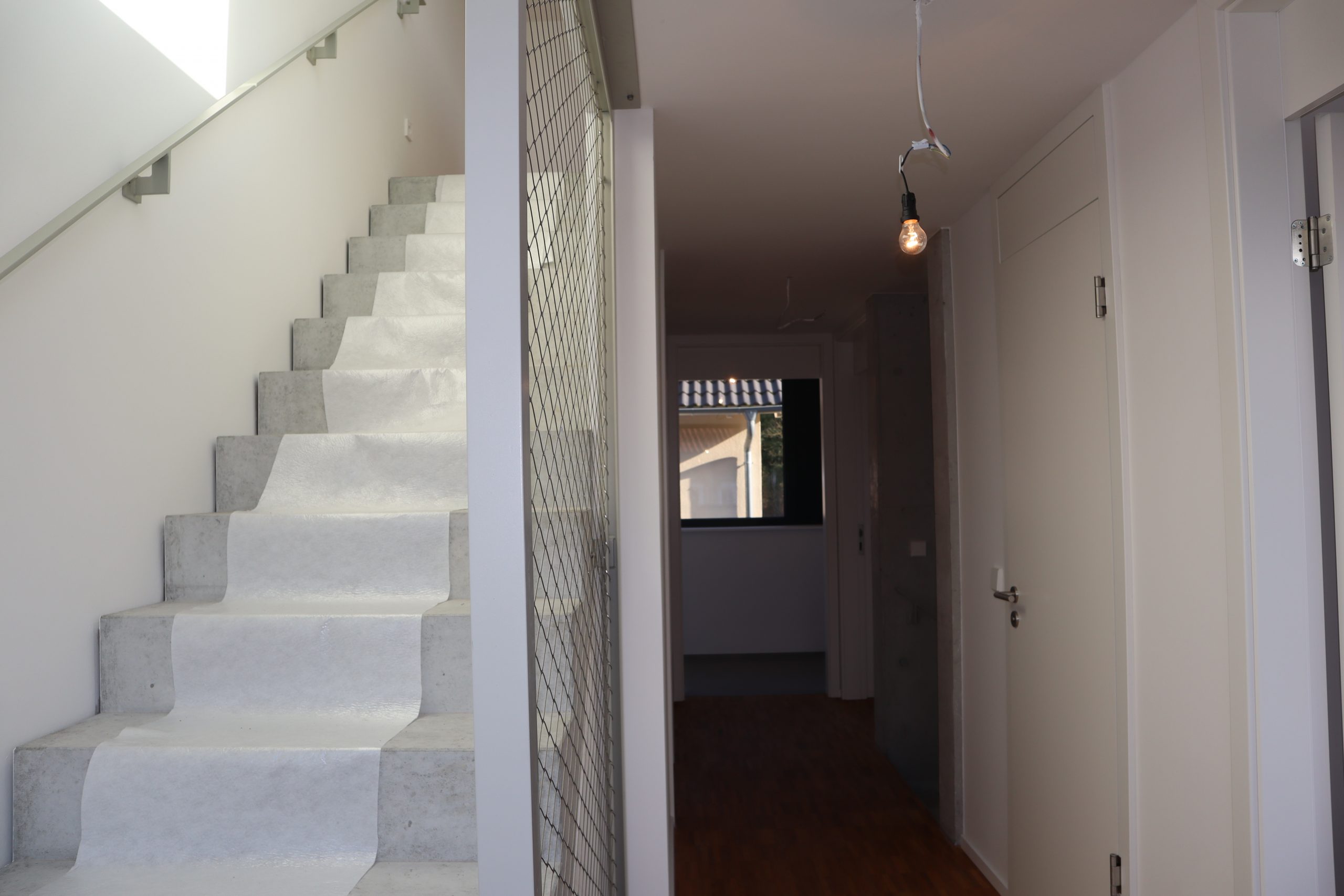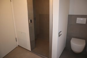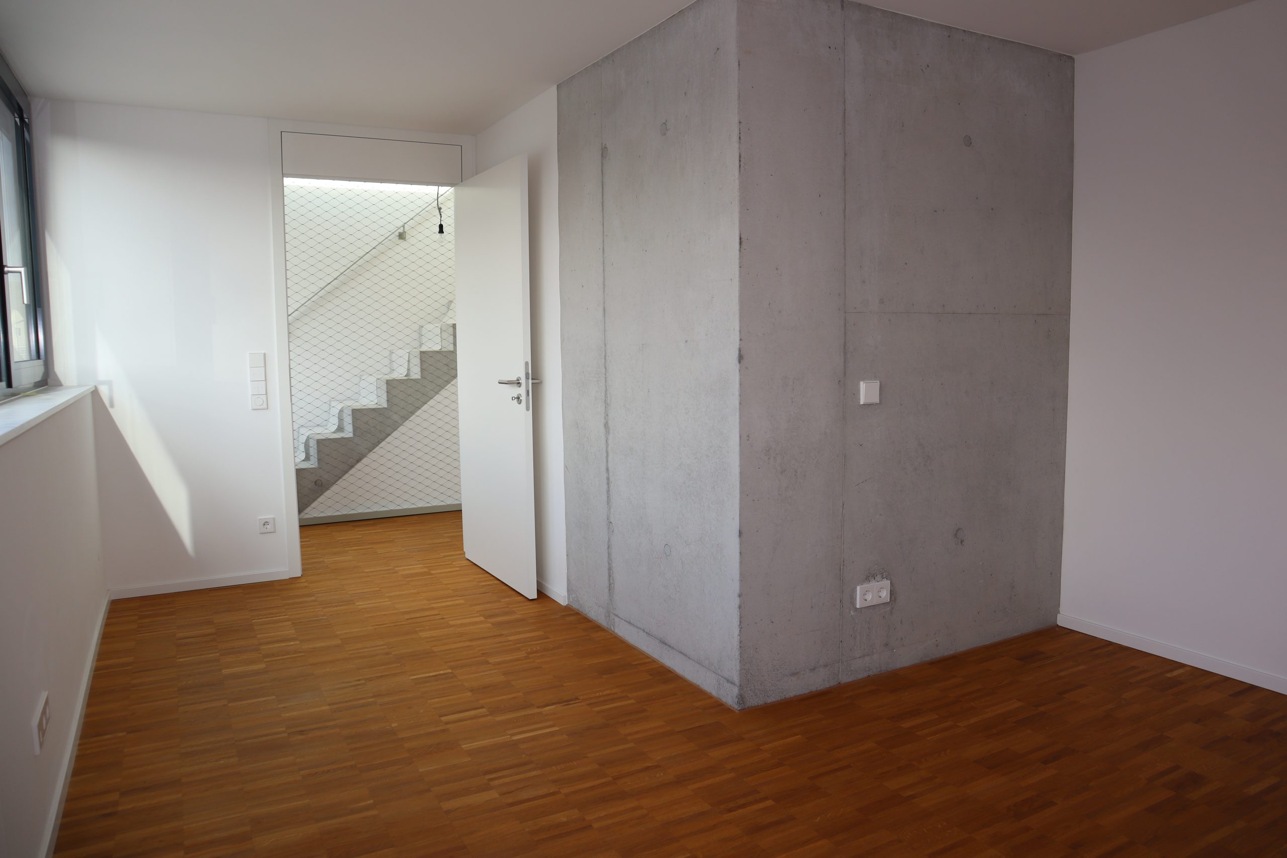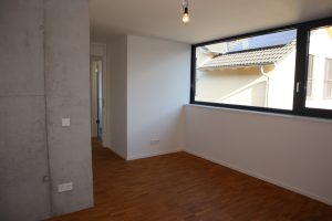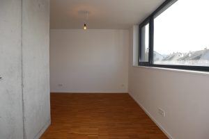 Im Obergeschoss befinden sich zwei Schlafzimmer, die jeweils mit hochwertigem Parkettboden ausgestattet sind. Große Fensterfronten schaffen ein angenehmes und lichtdurchflutetes Wohnklima. Ergänzt wird diese Etage durch ein separates WC sowie ein modernes Tageslichtbad mit bodentiefer Dusche. Die Sanitärräume sind mit eleganten grauen Boden- und Wandfliesen gestaltet. Sichtbare Betonelemente im Bereich des Treppenhauses verleihen auch hier eine exklusive, moderne Note.
