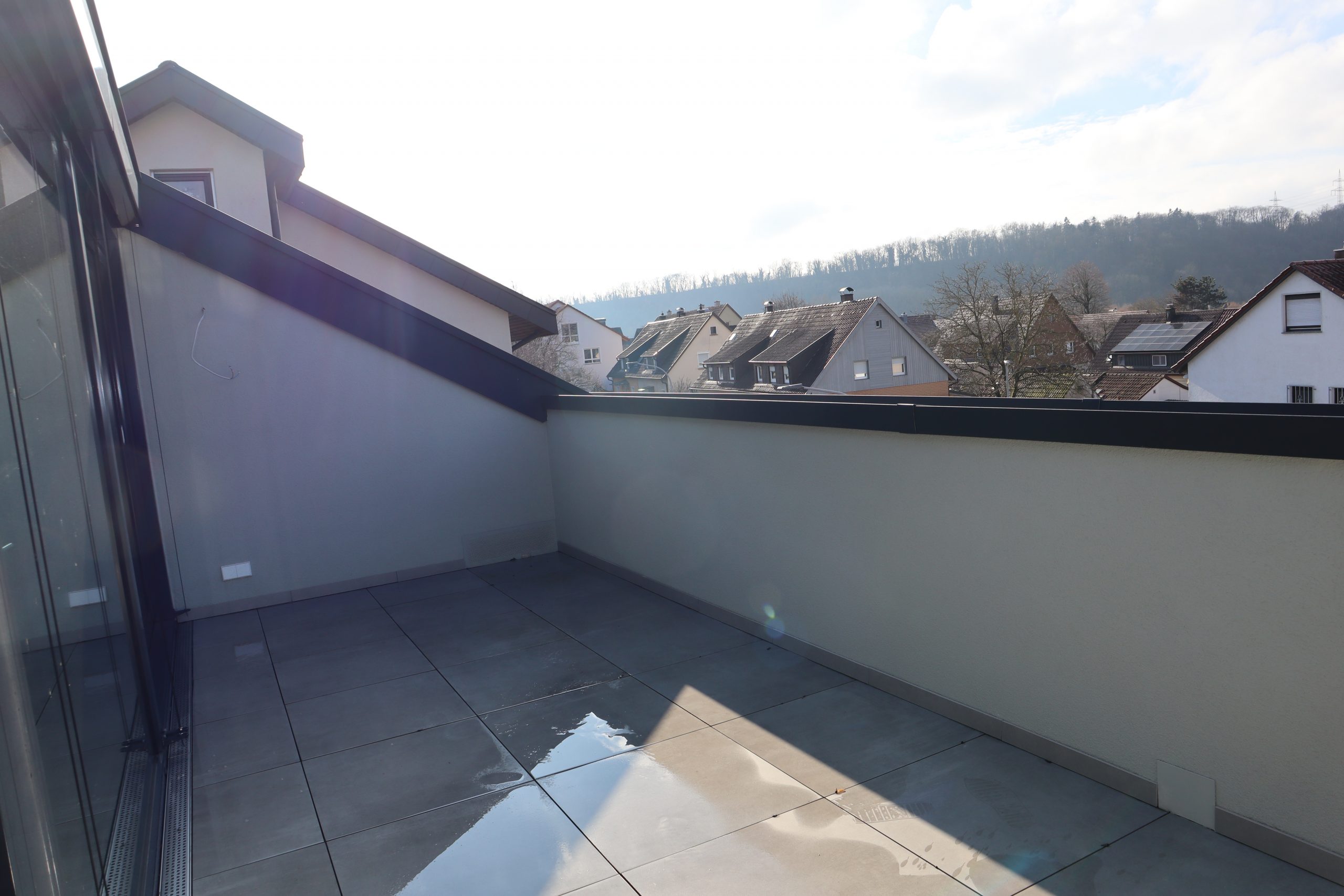Das Dachgeschoss bietet ein weiteres Schlafzimmer sowie ein Ankleidezimmer mit integrierter Arbeitsecke. Beide Räume verfügen über direkten Zugang zu einem großzügigen Balkon, der über eine große Fensterfront erreichbar ist und zusätzlichen Wohnkomfort bietet.