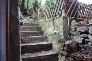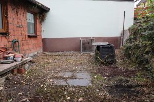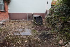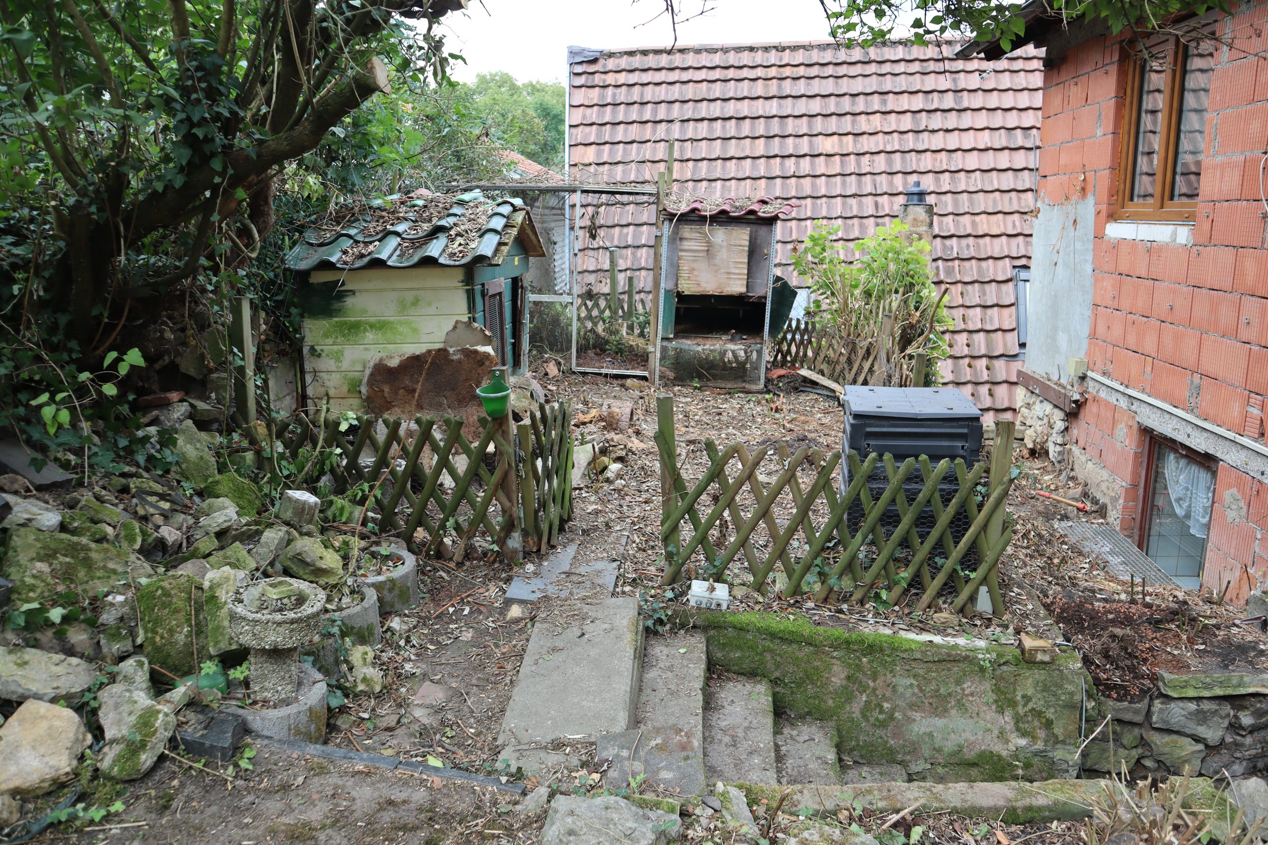 Der Hauseingang befindet sich im Kellergeschoss, von dem aus die Treppe in das eigentliche Wohn- und Erdgeschoss führt. Dort stehen ein großzügiger Wohn- und Essbereich, ein Küchenraum sowie ein Badezimmer mit Badewanne zur Verfügung. Von hier aus gelangt man auch direkt in den angrenzenden Gartenbereich. Mit etwas Aufwand lässt sich dieser in einen ansprechenden Rückzugsort im Freien verwandeln.