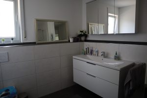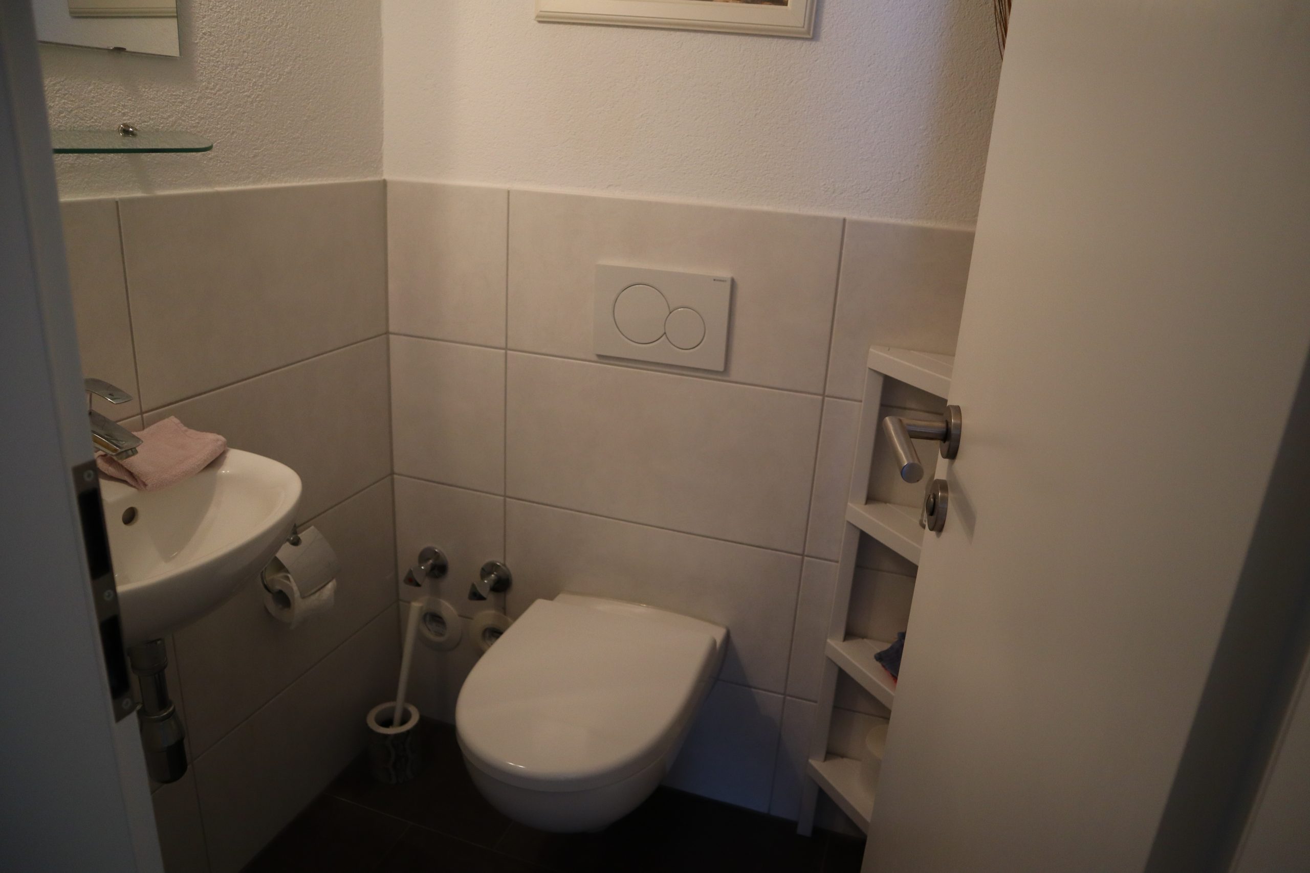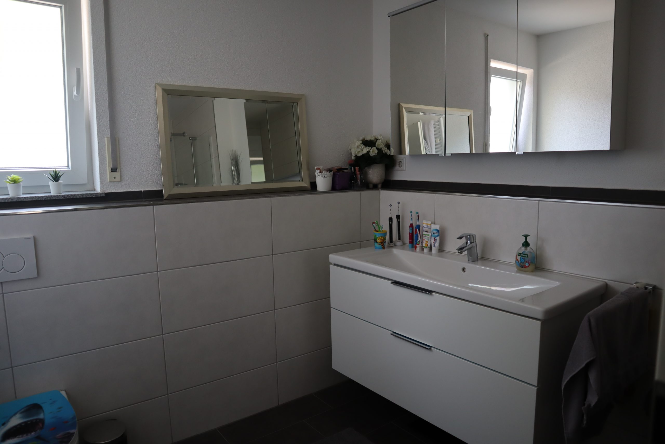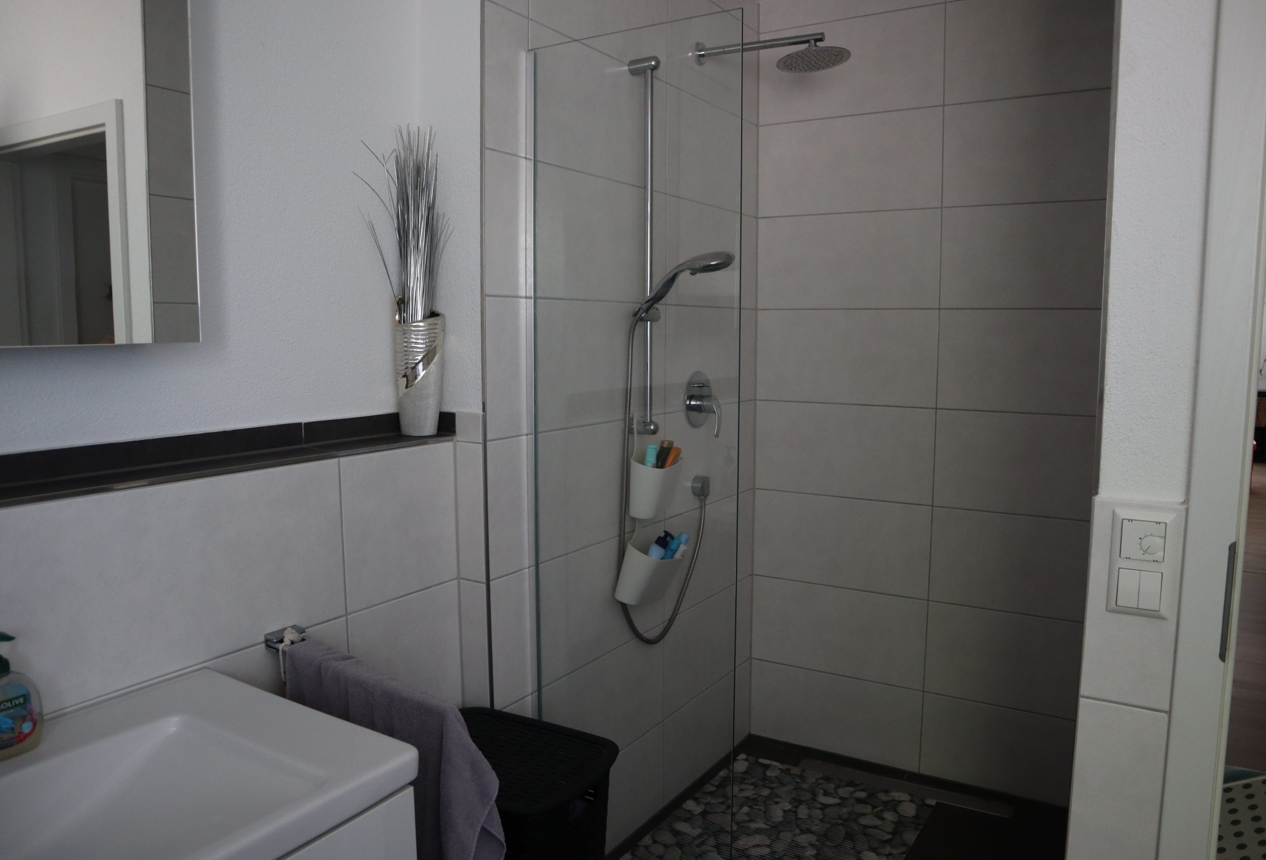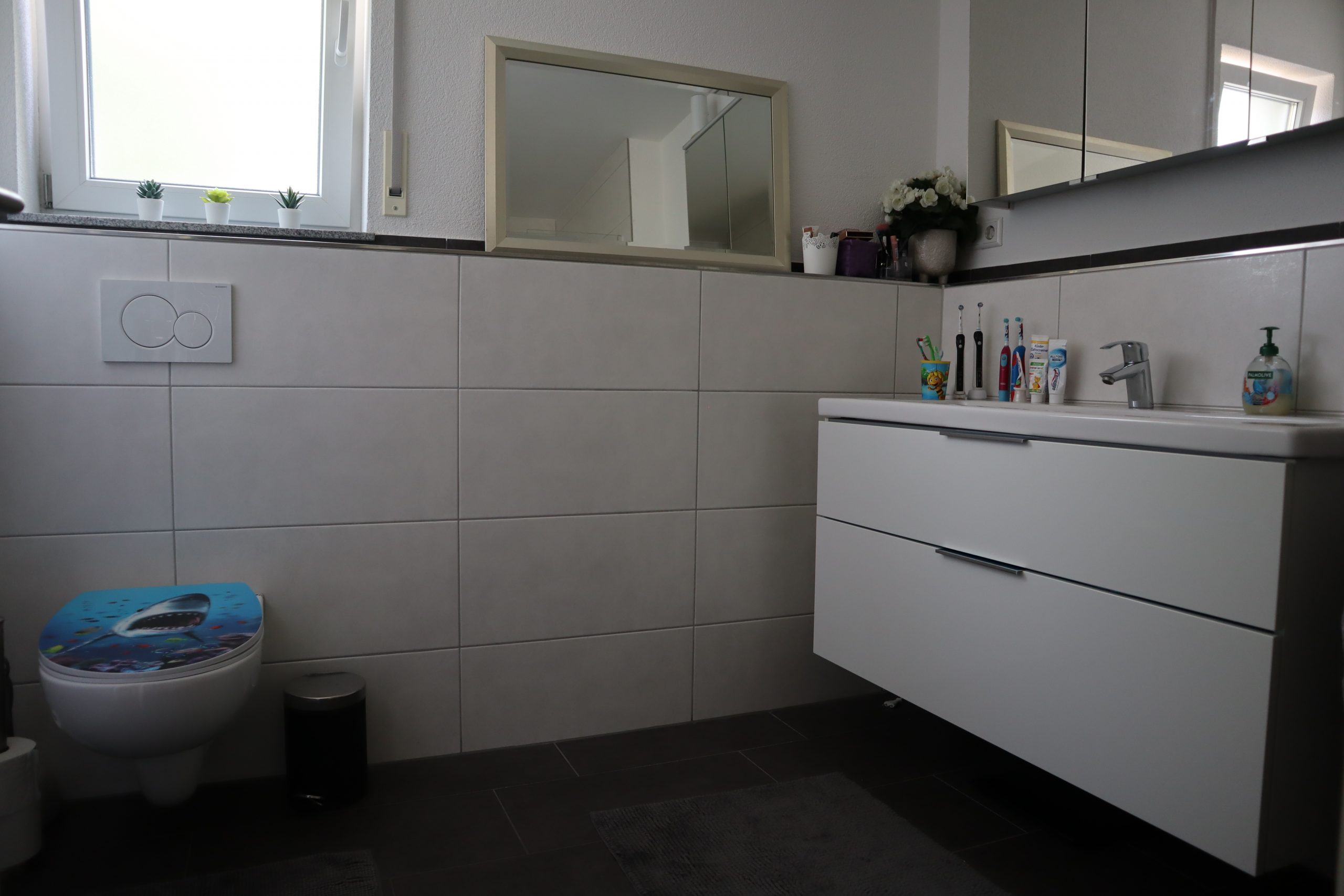 Das Tageslichtbad ist mit einer großzügigen, bodengleichen Dusche ausgestattet. Der anthrazitfarbene Fliesenboden in Kombination mit halbhoch gefliesten weißen Wänden unterstreicht den modernen Stil. Ein separates Gäste-WC ergänzt das Raumangebot.