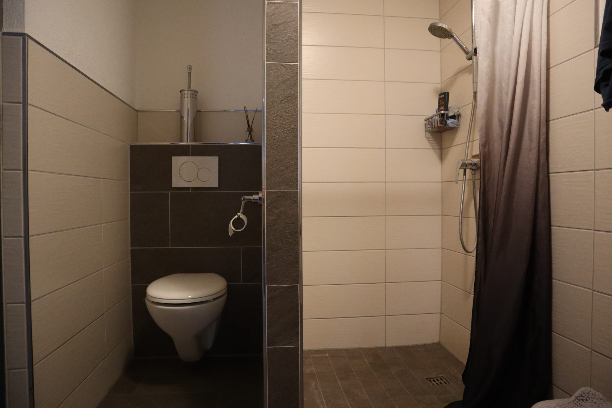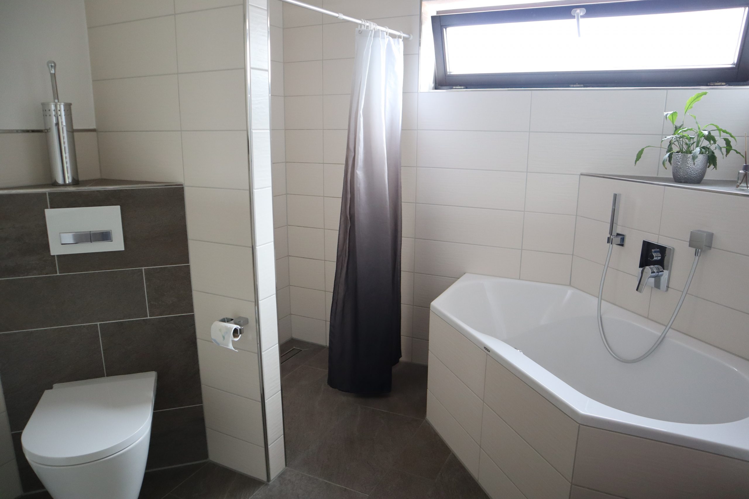 - 1 modernes Bad im Erdgeschoss mit bodengleicher Dusche und Badewanne