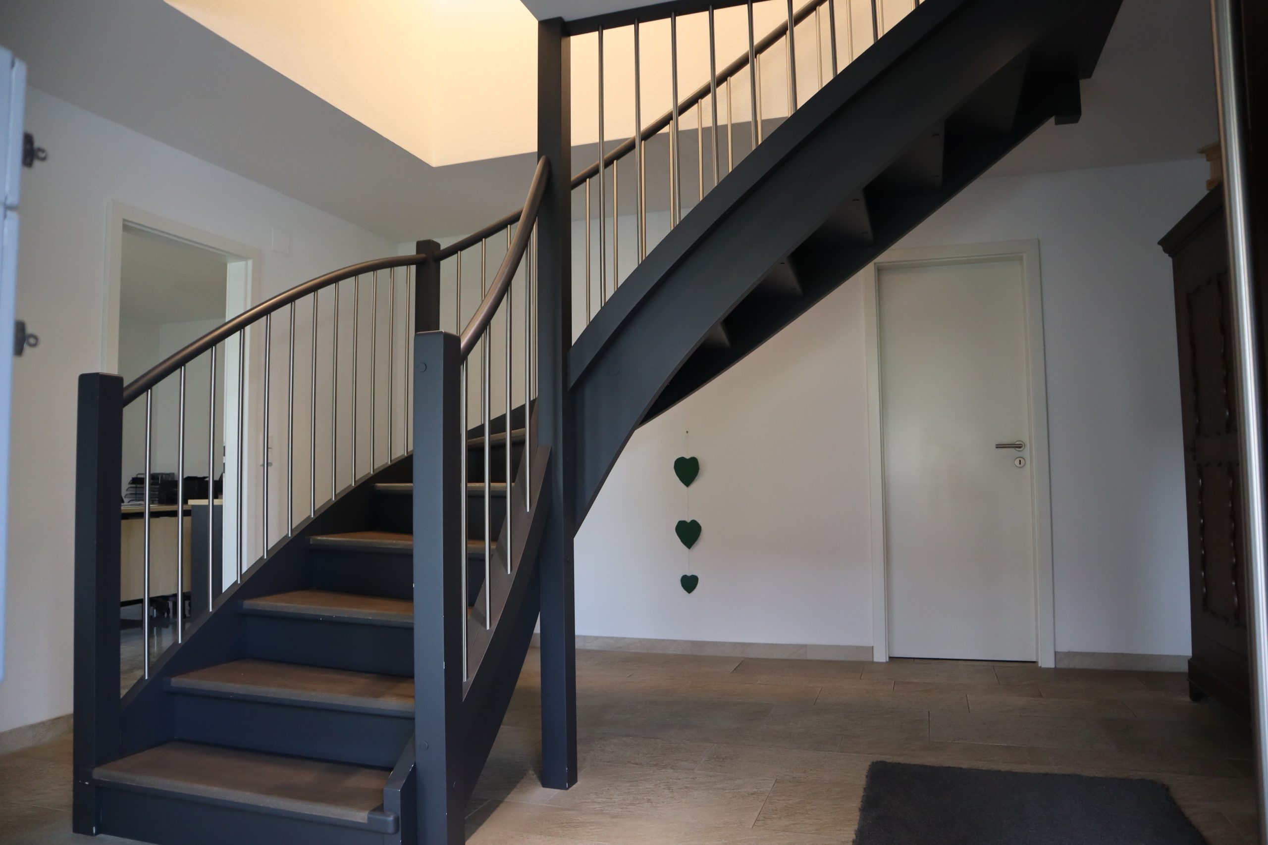 Betreten Sie das Haus über den Haupteingang, so gelangen Sie in einen offenen Bereich, von dem aus die Treppe direkt ins Erdgeschoss führt. Auf dieser Ebene befinden sich außerdem ein Zimmer, das sich ideal als Büro oder Gästezimmer eignet, ein Badezimmer sowie die Einliegerwohnung mit ca. 45 m² Wohnfläche. Diese verfügt selbstverständlich über einen separaten Hauseingang und bietet somit Privatsphäre für Angehörige, ältere Kinder oder auch zur Vermietung.