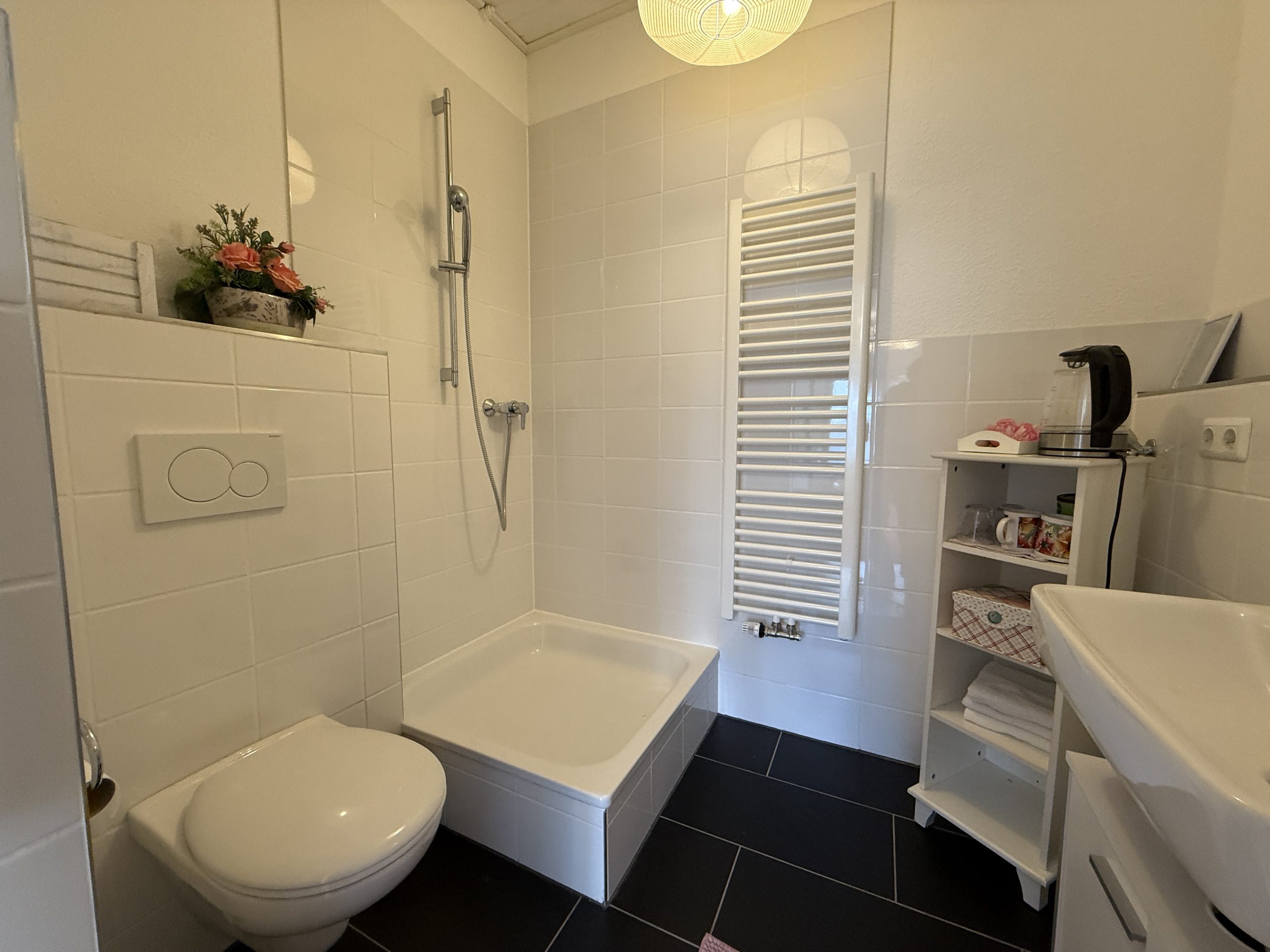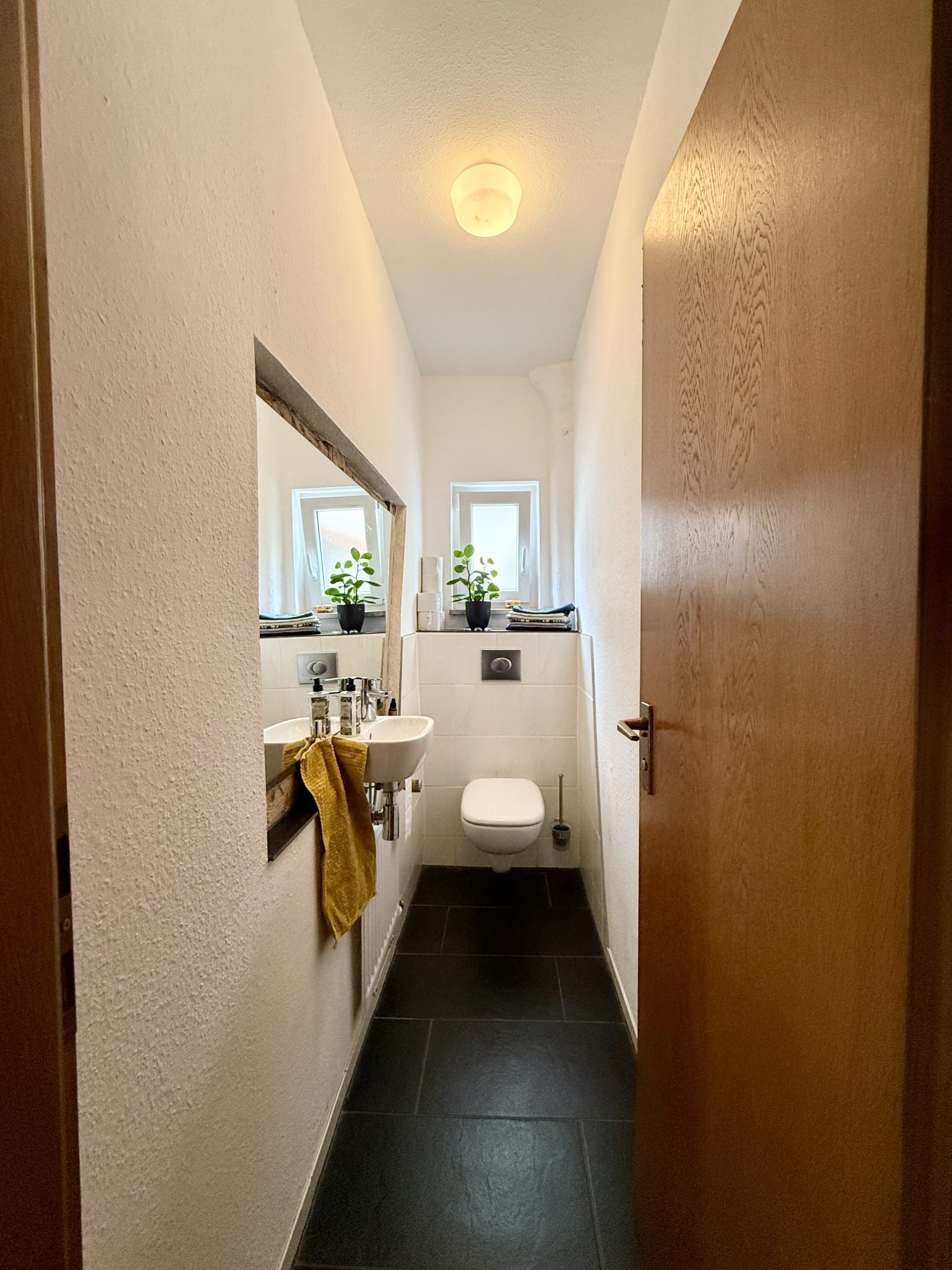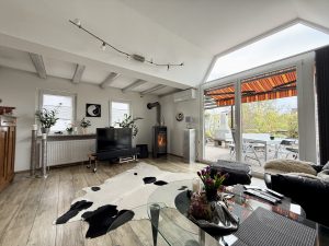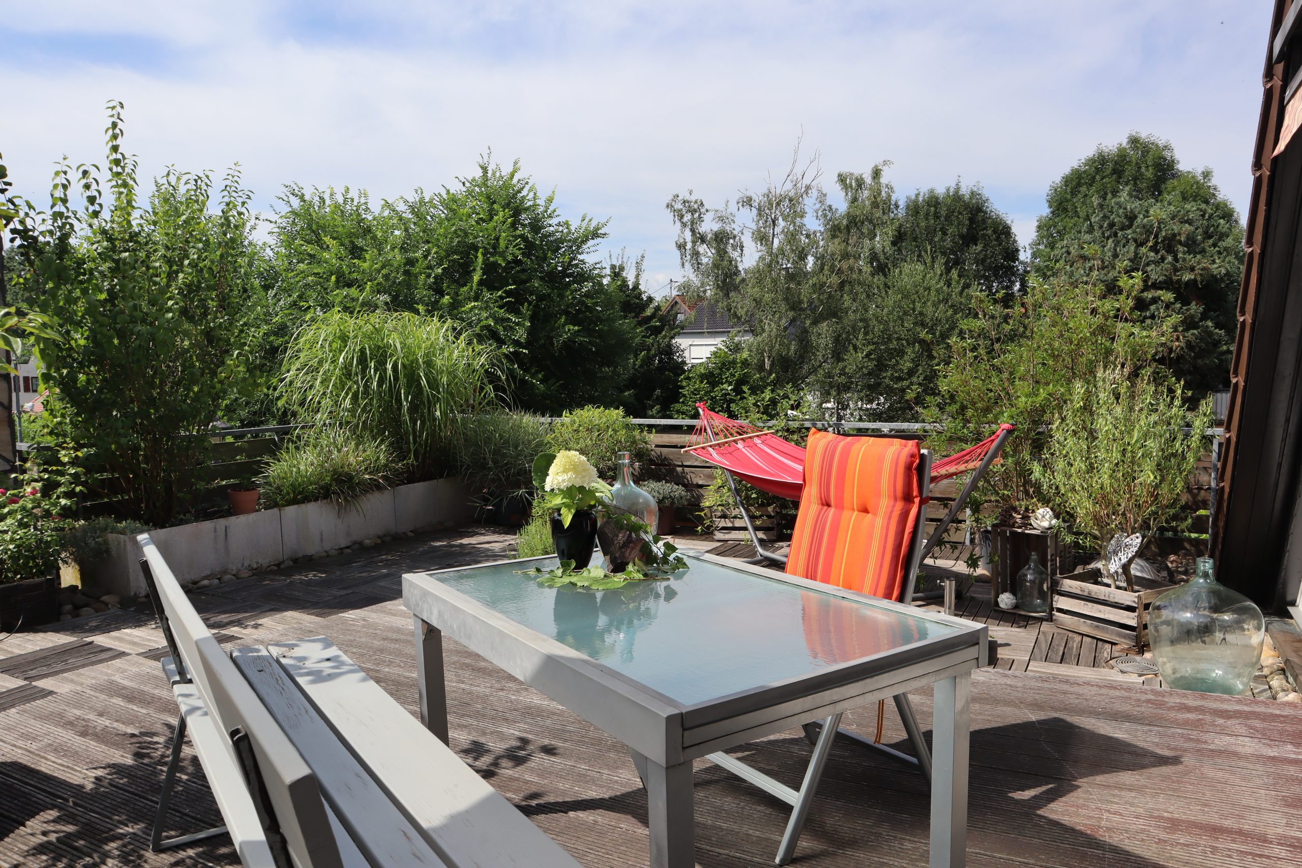 Die Hauptwohnung erstreckt sich über das Erd- und Obergeschoss und bietet großzügige Wohnflächen mit durchdachter Raumaufteilung. Im Obergeschoss gelangt man auf eine hervorzuhebende großzügige Dachterrasse, die sich über dem rückwärtigen Gebäudeteil erstreckt. Sie ist nach Süden ausgerichtet und profitiert ganztägig von Sonnenlicht – von den ersten Morgenstrahlen bis in die Abendstunden.Neben der idealen Ausrichtung bietet die Terrasse einen angenehmen, grünen Ausblick in südwestlicher Richtung, der Ruhe und eine einladende Atmosphäre schafft. Damit eignet sich dieser Außenbereich perfekt als private Rückzugsfläche oder als Ort für gesellige Stunden im Freien.