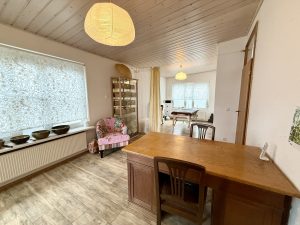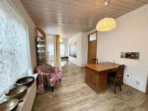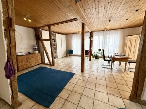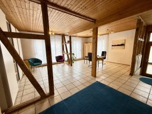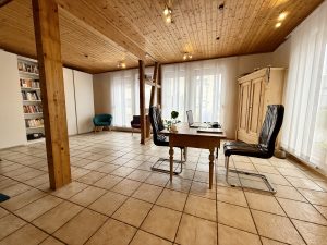 Im Erdgeschoss befindet sich im rechten Teil des Hauses ein großzügiges Einzelzimmer (ca. 45 qm) mit einem schon vorhandenem, separatem Hauszugang. Der Raum zeichnet sich durch seine Offenheit und Helligkeit aus: Mehrere große Fenster sorgen für eine hervorragende natürliche Belichtung und schaffen ein freundliches, lichtdurchflutetes Wohnklima. Zudem hat das Zimmer ein Bad und vorhandene Küchenanschlüsse. Dem Einzelzimmer ist ein eigener Kellerraum zugeordnet. Mit einigen wenigen Investitionen lässt sich dieser Bereich in kurzer Zeit in eine eigenständige Einzimmerwohnung umwandeln – ideal für Gäste, ein Büro oder zur separaten Vermietung. Die sichtbaren Holzbalken, der strukturierte Bodenbelag und die warme Holzdecke verleihen dem Raum zudem eine gemütliche und zugleich authentische Ausstrahlung.
